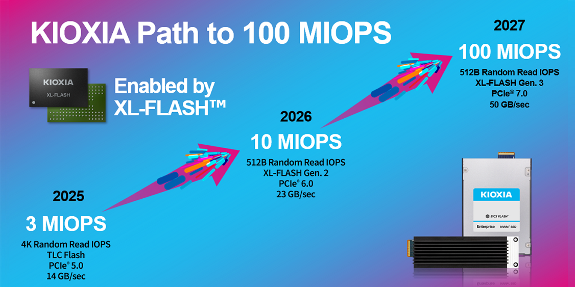 KIOXIA has named this Super High IOPS SSD product the KIOXIA GP Series. The first generation product of the KIOXIA GP Series is developed to the PCIe® 6.0 standard and the second generation product is targeted at a PCIe® 7.0 generation intercept to achieve 100 MIOPS.